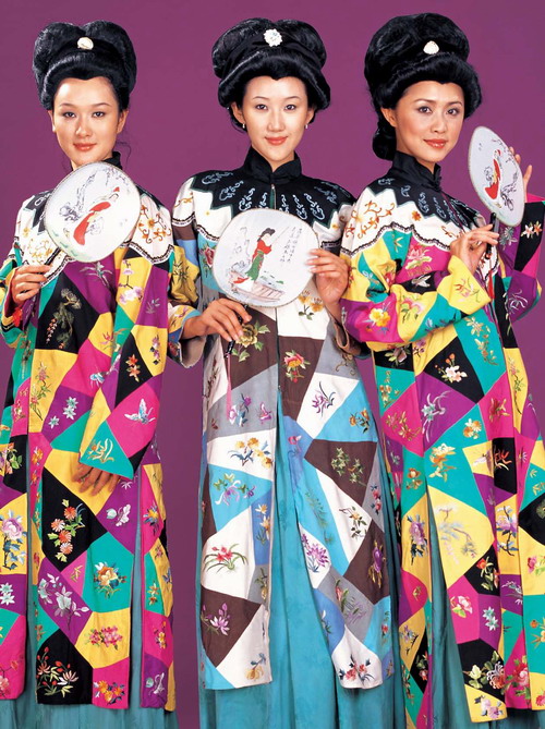 中国诗句中有“裁衣学水田”的描述,女子水田衣的浪漫和新奇从中可见一斑。水田衣是用许许多多零星的织锦缎料拼合而成的。这些缎料色彩不同,图案不同,大小不同,形状也各异,所以拼制起来的服装色彩斑斓,形如水田,具有一种极其特殊的装饰效果,受到明代女子的普遍喜爱。
