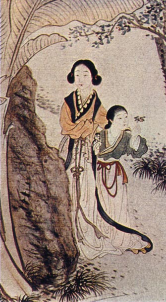 簪珠翠发饰的贵妇及挂玉佩的侍女(陈洪绶《夔龙补衮图》)