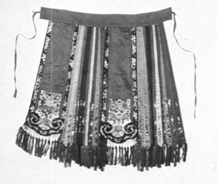 明代女子穿裙子比较普遍。裙子的颜色,开始流行浅淡的色彩,以素白居多,虽然上面有纹饰,但并不明显,即使施绣,也只是在裙摆处绣以花边,作为压脚。裙幅开始采用六幅,这也是遵循古训“裙拖六幅湘江水”。后来裙幅采用八幅,腰间细褶数十,行动辄如水纹。裙上的纹样,也更讲究。据说有种浅色画裙,名叫“月华裙”,裙幅共有十幅,腰间每褶各用一色,轻描淡绘,色彩非常淡雅,风动色如月华,因此得名。此外,还有的裙子用绸缎裁剪成大小规则的条子,每条绣以花鸟图纹,另在两畔镶以金线,称“凤尾裙”。更有以整缎折以细缱,做成“百褶裙”的。