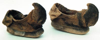 明代女子不仅沿袭了前代缠足的风俗,而且使之大胜。缠足后所穿的鞋叫做“弓鞋”,这是一种以香樟木制成的高底鞋。木底露在外边的叫“外高底”,有“杏叶”、“莲子”、“荷花”等名称;木底藏在里边的一般叫“里高底”,又称“道士冠”。老年妇女大多穿平底鞋,称为“底而香”。