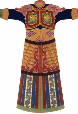 明光铠是中国古代著名的铠甲,它最大的特点就是在前胸和后背的左右各佩有一块圆形护镜,这种护镜在阳光下能闪烁反光,具有明亮的视觉效果,因而有了“明光铠”的得名。除护镜以外,明光铠在肩上还装有兽头形状的护膊,它既具有保护作用,又能显示出将士勇猛威武的气势。