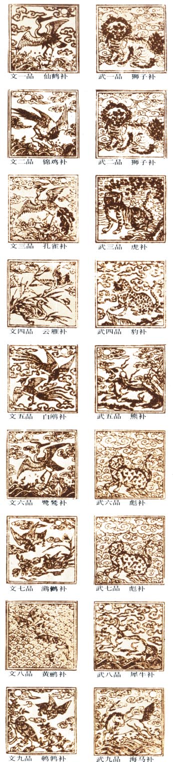明代官服上最有特色的装饰就是补子。所谓补子,就是在官服的胸前和后背补上一块表示职别和官阶的标志性图案,补子一般长34厘米,宽36.5厘米,上面织有禽兽两种图案:文官一品用仙鹤,二品用锦鸡,三品用孔雀,四品用云雁,五品用白鹇,六品用鹭鸶,七品用鸂鶒,八品用黄鹂,九品用鹌鹑,杂职用练鹊;武官一品二品用狮子,三品四品用虎豹,五品用熊罴,六品七品用彪,八品用犀牛,九品用海马。