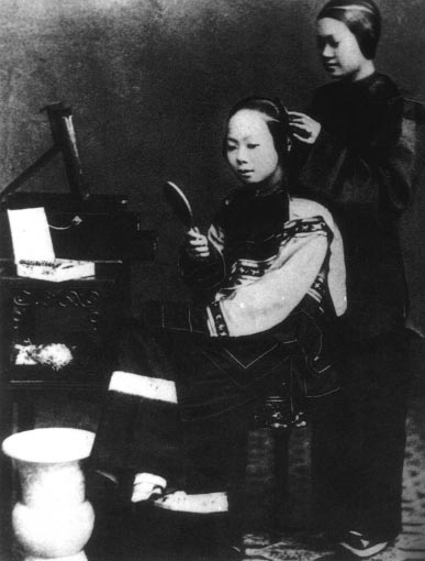 女子的发式,随着流行而不断变化。曾经时尚的发髻有螺髻、朝天髻、空心髻、盘辫髻、堕马髻、舞凤髻、蝴蝶髻等等。年轻女子除了梳髻以外,有的还留一缕头发于额上,俗称“前刘海儿”。前刘海儿的式样一般都盖在眉间,也有遮住两眼的,还有将发剪成圆角,梳成垂丝形的;或者将额发分成两绺,并修剪成尖角,形如燕尾,时称“燕尾式”。到了民国初年,更风行一种极短的刘海儿发,远远看去若有若无,名叫“满天星”。女子剪发以后,一般多用缎带束发,也有用珠翠宝石做成各种发箍套在发上的。大约是20世纪30年代的时候,烫发流传到中国。当时大城市的女子,发饰大都模仿西式,有的还把头发染成红、黄、棕、褐等各种不同颜色,以此为时髦。