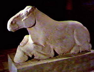 跃马,石刻高1.14米,长2.60米。作品所表现的是一匹转战千里、久经沙场的战马。那修剪得整齐的短鬃,短而尖的双耳,以及惊觉的神态,流露出作者的寓意。马头上仰,似乎在谛听远方传来的声音,注视着前方的动静。右前蹄略微抬起,左前蹄紧扣住地面,后腿正在用力,这是从卧转入起时一瞬间的动作。静中有动,具有强烈的艺术效果。