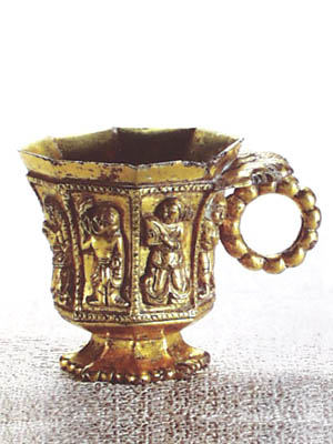 杯腹以棱面为单位,各作一高浮雕男子,或歌舞、或捧物,神态自然。人物四周环以金珠,杯把作联珠圈状,指垫两侧各作高浮雕的老人头像,深鼻高目,长髯下垂,具波斯特色。