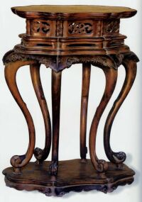 香几大多成组成双使用,古书中曾对各种香几详细描绘:“书室中香几之制,高可二尺八寸,几面或大理石,或岐阳,玛瑙石,或以骰子柏镶心,或四、八角,或方或梅花、或葵花、茨菇、或圆为式,或漆、或水磨,诸木成造者,用以阁蒲石,或单五笔型中置香缘盘,或置花尊以插多花,或单置一炉焚香,此高几也。”说明了香炉不仅是置香炉之用,也是点缀文人雅室的艺术品。