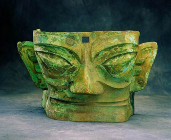青铜人面具:高22.5,宽42.5。面具呈方形,宽颐,广额,长眉,直鼻,长耳,耳廓较宽,耳垂有穿孔,耳前面颊的上、下及额部正中各錾凿一方孔。三星堆祭祀坑共出土人面具20余件,分大、中、小三型。该件人面具为中型面具。