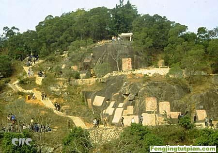 关于九日山命名的由来,相传晋代永嘉年间,北方社会动荡,战乱频繁,部分衣冠士族为了避祸南渡入闽,沿南安江聚居,这些被迫离乡背井的中原人士,每年九九重阳的时候都喜欢齐聚于南安江边的山上,登高远眺,寄托乡思,久而成习,所以此山被称为“九日山”。据《南安县志》记载:“自晋以来,士大夫避世多游息赋咏于此,至唐而益盛,笔墨与兹山并传。”至今九日山上还保存有唐宋元明清各朝文人的诗文石刻75方,由此足见九日山人文景观之兴盛。九日山高约八十余米,多巨岩悬崖,分东西北三峰。山后戴云山脉迤逦自闽中腹地,山前晋江流水蜿蜒于泉州平川,山上相思林掩映摇翠,山下金溪江碧波荡漾,青山碧水竟相辉映。因为风光景色旖旎迷人,吸引了众多游人来此登临栖憩,很快就成为闽南著名的旅游风景区。