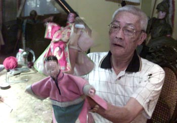 老艺人陈锡煌先生在示范布袋木偶的动作