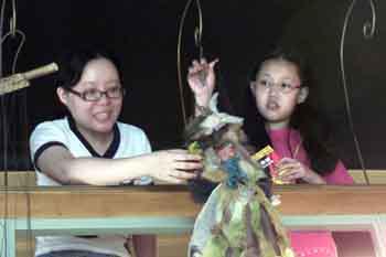 偶戏馆中观众可以自己亲自操作,这是一对母子在体会操作提线木偶的乐趣。