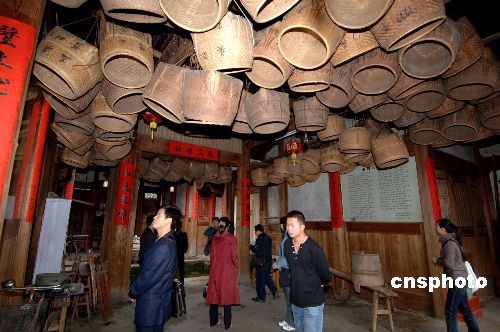 在福建省闽西山区,有一个至今保存完好的连片成群的客家古老村落,这就是已有800多年历史的连城县培田明清古民居。培田古民居建筑群由30幢高堂华屋、21座古祠、6家书院、二道跨街碑坊和一条千米古街构成。图为游客参观挂满箩筐的中厅。(王东明)