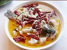 5、辣椒颜色快变时,立即关火,把锅中的油及花椒辣椒一起倒入盛鱼的大盆中。