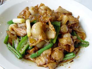 回锅肉 原料: 猪腿肉275克,熟猪油25克,蒜苗50克,豆豉5克,甜酱5克,红酱油(用酱油加红糖、饴粮、香料熬制而成)1/2茶匙,郫县豆瓣2茶匙,梗姜葱(姜块、葱丝)、花椒各少许,酱油适量。