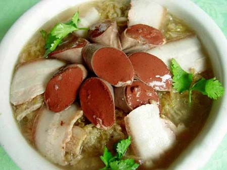 原料:新鲜肥猪肉100克、猪血旺150克、猪肝50克、猪大肠50克、白豆腐100克、酸菜100克。