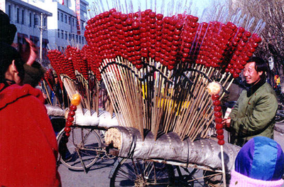 冰糖葫芦堪称最原始也最传统的糖果了。和后来商店里零售的各种用塑料纸或锡箔包装的水果糖存在着本质的区别。前者讲究以鲜果(包括野果)为材料,尤以山楂为佳;后者则徒有果味而已……这就是“糖”与“果”概念上的不同。