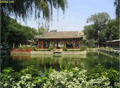后罩楼后即是花园——箤锦园,占地38.6亩,园内曲廊相通,亭榭点缀其间,山石嶙峋,碧水如带,景致变幻无穷。主要建筑有邀月殿、大戏楼、沁秋亭、榆关、独秀峰等。由于恭王府富丽堂皇,风景幽深秀丽,与曹雪芹名著《红楼梦》中所记荣国府和大观园极为相似,因此一向被传称是贾宝玉的住所,也有人认为是奕訢根据《红楼梦》描述的大观园仿造的。恭王府东侧即什刹海,这里水面宽阔,垂柳依依,自清代起就是人们游乐消夏之所。附近又多名园、王府、古庙,更增进了这一带的繁华。