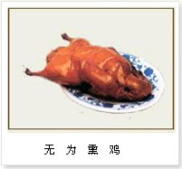 无为熏鸭 又称“无为板鸭”,产于巢湖市无为县,距今已有200多年的历史。其制作精细,选料讲究,风味别致,色泽金黄油亮,皮润肉嫩,在江淮一带颇有名气。已收入《中国名菜谱》。