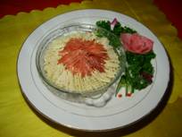 此菜乍看像极一颗象牙色珍珠浮在清清的水面上,一小簇鲜绿的葱丝让人产生无限遐想。这是由切得极细的安徽歙县笋丝垒成的,拨开象牙色城堡,里面依次呈现肉丝、冬菇 丝。夹几根笋丝细细一品,其味清淡爽口,有香菇的香,肉丝的鲜,还有一股土鸡特有的鲜香味。