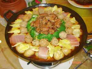 黄山人冬季常吃的一种火锅。相传,此菜由明代石台县“四部尚书”毕锵的一品诰命夫人余氏创制。一次,皇上突然驾临尚书府作客,席上除了山珍海味外,余夫人特意烧了一样徽州家常菜-火锅。不料皇上吃得津津有味,赞美不绝。后来,皇上得知美味的火锅竟是余夫人亲自所烧,便说原来还是“一品锅”!菜名就此一锤定音。 “一品锅”的烹调比较讲究,在火锅里,锅底铺上干笋子,第二层铺上块肉,第三层是白豆腐或油炸豆腐,第四层是肉圆,第五层盖上粉丝,缀上菠菜或金针菜,加上调料和适量的水,然后用文火煨熟即成。此菜乡土风味浓,味厚而鲜,诱人食欲。