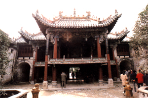 整个建筑融会了南北建筑艺术风格,而且至今保存完好,这在皖北大地极为少见。其木雕、砖雕、石雕绝对可与皖南的三雕比肩。仅山门的正门上就密密麻麻镶有44副不同题材的砖雕,在那厚不足二寸,宽不过咫尺的青砖上,雕刻者以切、勾、削、凿、剔等多种手法,将小小的一块砖透雕成数层,不论您从哪个角度都能欣赏到绝妙的图案。最具功力的是那直径只有5毫米的图孔,满球雕花,层次丰富,令人叹为观止。山门前那一对道光元年(公元1821年)铸就的铁旗杆上,飞龙灵凤形神俱备,一阵风指过,铃铛丁当作响,清脆、悠扬,细听别有一番情趣。戏楼除了木雕精美外,其彩绘也非常精彩。采用民间“一色三套平涂”的手法绘出,就像是中国的工笔重彩年画,给人以强烈的视觉冲击力。戏台两个场门的额书更是耐人寻味:“想当然”、“莫须有”。具体何意,您自己想吧。