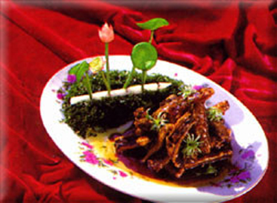 鳝鱼味美,且有药用价值。《名医别录》说它有补五脏、疗虚损的功效。荆沙皮条鳝鱼其做法讲究,尤重火功技术,活鳝鱼宰杀洗涤,去骨后切成条状,挂糊,用油几次氽炸到皮酥,再挂上糖醋汁即成,形似皱皮蛇条,色泽褐亮透明,外酥脆,内油嫩,味道香甜醇厚。