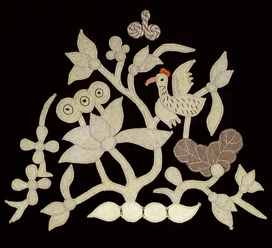 布贴 布贴亦称补花,是刺绣的一种形式。它利用做衣被剩下的边角碎料,在底布上拼成各成图案,先用浆糊贴牢,再用针线沿着图案纹样的边锁绣,将其固定。鄂东南阳新一带农村姑娘出嫁,大都随身携带一个别致的“布角包”,内装缝制嫁衣嫁妆时余下的各种布头。过门后,利用时间为未出世的小宝宝缝制布贴衣物、抱裙、涎兜、鞋帽等,不用花多少钱,而且做出的东西漂亮结实耐磨。布贴独特的刺绣制作方式,使它更注重整体的布局和变化,不拘泥繁琐的细节。