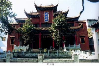 归元禅寺坐落于汉阳旧城西5里,即今武汉市汉阳区翠微街横路5号。始建于1658年(清顺治十五年),由白光和尚与其胞弟立峰和尚主持经营,他二人遂为归元寺之开山祖。二位法师俗姓殷,浙江吴兴人。相传白光祖师殷德明于明崇祯年问,任汉阳知府,有感于明末战乱,百姓流离失所,遂回老家,于龙华寺剃发为僧,由他的师父慧峰和尚取法名白光。白光在清朝初年云游汉上,先在汉口十方庵挂单为行脚僧,后又入汉阳太平兴国寺阅藏,见经卷散乱破损,化缘3年修藏。时人以此相推崇。法师又善华佗之术,为贫苦百姓施医送药。他目睹战乱频仍,灾疫横行,饿殍当道,乃于1658年先建普同塔院收殓白骨。汉上巨贾孙耀先等嘉其善道而捐巨款筹建梵宇,意在弘扬佛教。先购得原为明末文人王章甫所有之葵园为道场,然后鸠工庀材,经营栋宇。1660年建佛堂、禅堂,开始接众行道。翌年修大雄宝殿并额堂、斋堂。1662年(清康熙元年)增其旧制,建祖堂、韦驮殿与方丈室。直到674年,藏经阁、钟鼓楼、云水堂、内外寮舍、三祖塔院及大三门方始落成。前后规治16年,苦心经营,归元禅寺初具丛林规模。白光、立峰祖师从《楞严经》中文殊法师偈语“归元性无二,方便有多门”中取“归元”为其寺名。