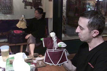 大稻埕偶戏馆的意大利籍艺术家在认真揣摩偶戏人物的动作。