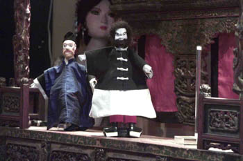 偶戏馆中观众可以自己亲自操作,这是一对母子在体会操作提线木偶的乐趣。