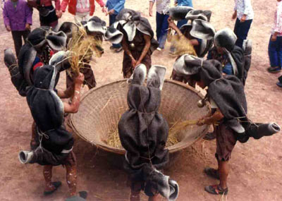 出虎日傍晚,黑虎头子大吼一声“罗嘛”(虎啊),紧接着一声炮响,4只黑虎从场子四方跳出,各自用力抖动颈上的铜铃,黑虎头子率众虎跳“绞篾舞”,村民手执香火围着众虎跳“回环舞”、“逆流舞”等舞蹈。场子边上有穿黄衣者4人用单面扇形鼓伴奏,人们在欢乐中直跳得精疲力尽时方休。此后,每日增加一虎入场跳虎舞,加到8虎时,众黑虎跳“耕地”、“撒种”、“薅草”、“收割”、“打谷”等生产舞,以及“虎亲吻”、“虎交尾”、“虎护蛋”等生殖舞和“虎搭桥”、“虎盖房”等生活舞。