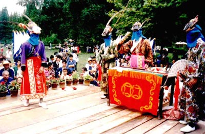 屯堡人主要信奉坛神。祭祀活动,以跳神(地戏)为主的,多为“调北征南”屯军后裔。跳神一年两次,正月初一到十五,要戴着脸子(面具)跳神、演地戏。新正聚戏是屯堡人交流、认同的一种情结,具有强烈的内聚力。“调北填南”民屯后裔,春节期间要举行“跳花”活动,“跳花”时手执彩灯和画像,走村串寨,以图吉利,“跳神”与“跳花”,互相穿插,香烟缭绕,笙鼓齐鸣,十分热闹。这是屯堡人“离乡不离腔“的民俗心理形成的几百年古朴而固执的民风,正是这种民风,使军傩地戏历久不衰。民族迁徙与屯堡文化、民族迁徙与傩文化是两个深层次的文化史课题,有待深入发掘与研究。(庹修明)