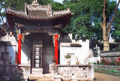走进树丛,一座古朴的木牌坊迎面而立,它四柱三门,中门高大,门额有横匾,匾上雕着“誉延嘉树”四个斗大的古体字。过木牌坊不远处有碑亭一座,亭内矗立着一块高大的石碑,上书“古大槐树处”五字。石碑矗立处,就是“誉延”数百年的第一代大槐树生长的地方。这棵大槐树在地面消失之后,从根部又生长出一株小槐,人称第二代。这株第二代槐树不知何年又干枯了,如今树体尚在,枝叶全无,挺立于碑旁。说来有趣,第二代死后,从它的根部又生出一棵第三代来,30多年来,年年枝繁叶茂,一年比一年高大。