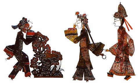 山西皮影,作为一种民间传统的小戏,在表演时,以驴皮、牛皮刻制的人物、布景和道具搬上舞台,造成影像,亦即“皮影戏”。这种形像的造型特点是:戏剧中的人物形像都是正面和侧面的。由于皮影戏表演中的局限性,只能通过正侧面的影像的活动展开戏剧情节。自然,这种美术造型也只能是运用正侧面这种角度才能最为典型地表现出戏剧艺术造型。由于皮影戏只宜表现高、长度的空间,因而与剪纸的表现方法有相似之处。人物的生、旦、净、末、丑各种角色,与戏剧上的脸谱、服装的程式是相通的。皮影戏的装饰性,尤其是夸张手法极强,在布景方面,有着殿阁、楼台、庭院、山水、树石等;道具中,有桌、椅、车、剑、戟、刀枪等,造型颇为概括洗练。
