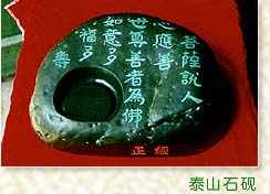 巍巍泰山,人杰地灵,物华天宝。六千多年前的泰安大汶口人,已使用玉石、玛瑙、绿松石等材料雕磨精美的工艺品。泰山奇石散见于泰山山麓,多为热液型、风化亮型、沉积型,神韵天成,石质如玉,亦有罕见的玉髓、玛瑙、宝石类奇石。具有天然艺术价值和工艺价值的多姿多彩的泰山奇石,或圆润无瑕,或呈天然“龟纹”、“闪电纹”和其它丰富生动的地质纹理,历尽沧桑,风骨依然,有的堪称稀世珍品。泰山奇石砚的制作以“天人合一”为原则,以求使其具有较高的自然艺术观赏价值、历史人文价值和实用价值。泰山奇石砚分别以“形”、“色”、“纹”、“景”、“情”、“人”、“物”赋名,发墨如油,独具特色。泰山奇石砚将作为一束艳丽的奇葩奉献给中外朋友,愿古老而神奇的泰山石赐福于世界人民。