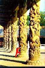 杏坛位于大成殿前甬道正中,传为孔子讲学之处,坛旁有一株古桧,称“先师手植桧”。杏坛周围朱栏,四面歇山,十字结脊,二层黄瓦飞檐,双重半拱。亭内细雕藻井,彩绘金色盘龙,其中还有清乾隆“杏坛赞”御碑。亭前的石香炉,高约1米,形制古朴,为金代遗物。