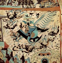莫高窟第249窟、第257窟壁画所呈现的火焰般颤栗,表现出一种炽热的激情,令我们想起哥特风格的基督教绘画,佛、菩萨、飞天等形象,很容易使人联想起基督教早期绘画中的圣人和天使。而实际上,那不过是古代帛画及汉代画像砖艺术的一种延续,如同我们在顾恺之的作品中曾经看到的,其实是以传统方法,如飘举的锦带、纷繁的散花等中国式装饰,加诸印度式形体之上,将庄严、沉寂的场景布满流动的云气,显得丰富、神秘。多处《狩猎图》、《鹿王本生图》,将佛经故事里的情节与汉代画像砖的射猎图案合而为一,人和动物的象征化表现形式都顺应了佛教传播的启示性叙述;配景方面,山川、树木的表现则借助了莫高窟所在地域的现实素材;在设色上,用土红色做底、以便施加厚色的画法,亦为汉代错金银工艺品、漆器以及墓室绘画所常见。