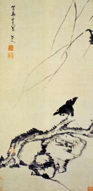 朱耷(1626-1705年)即八大山人,他不仅是皇室的“王孙”,而且生长于书香门第,明朝覆亡后落发为僧,后为道士,居“青云谱”,号八大山人、雪个、个山、一个山、良月、道朗等。他的画往往缘物抒情,以象征、寓意和夸张的手法,塑造奇特的形象,抒发愤世嫉俗之情和国亡家破之痛。笔墨洗练雄肆,构图简约空灵,景象奇险,格调冷隽,达到了笔简意赅的艺术境地。他的山水取法董源,更取董其昌明洁秀逸而滋润的笔意;花鸟画受明代林良、徐渭影响,自成一格,一花一叶,一鸟一石,结构奇特,生趣盎然。在一幅白纸上,他往往只用墨画一只鸟,一尾鱼,或者一朵花,造成玄奥的意境。八大山人不仅将书法的原理用于用笔,而且运用于章法布置,因此他的画面构成有基于抽象思维的控制,表现万物,基本只用墨笔,似乎墨色的花鸟山川就是他眼睛看到的世界,而拒绝使用颜色。显然对他的水墨画而言色彩是一种干扰,其强烈的形式感和象征意味,也是对他意欲表达的极端情感的某种适应,包括对现实的诅咒和规避,对覆亡的明王朝的无限眷恋和哀悼。