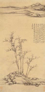 倪瓒(约1306-1374年),初名埏,字元镇,号云林子、幻霞子、荆蛮民、经锄隐者等,江苏无锡人。与吴镇相反,倪瓒生于豪富家庭,自建园林,筑“清阁”,幽静之致,惟闻鸟声,书画文玩,藏于阁中。至晚年,他的出世思想加剧,变卖田产,时逢社会动荡,他索性弃家遁迹,扁舟斗笠,往来于湖柳间,历二十年。也就在这个时期,他更专注于画事,在山水画上自成一格。晚年因反对税官被捕,获释不久后死去。倪瓒的画法,受董源影响最大,参以荆浩、关仝技法,用笔方折,创“折带皴”,写山石树木兼师法李成。所作多取材于太湖一带景色,疏林坡岸,浅水遥岑,意境清远萧疏。他的布局,往往近景是平坡,上有竹树,其间有茅屋或幽亭,中景为一片平静的水,远景是彼岸,为起伏无尽的山峦。用笔轻而松,燥笔多,润笔少,墨色简淡,却厚重清温,无纤细浮薄之感,能以淡墨简笔,有神地笼罩住整个画面,识者谓其“天真幽淡,似嫩实苍。”早中期画作浑厚之中间出以萧散秀逸,晚年画作苍劲之中又出以蕴藉高旷,有一种萧瑟荒寒之感。其“简中寓繁”的风格,对明清文人水墨山水画影响颇大。传世作品有《杜陵诗意图》、《狮子林图》、《渔庄秋霁图》和《六君子图》等。