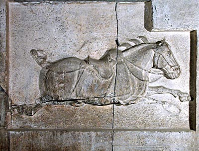 昭陵六骏是一组纪念碑式的浮雕,内容反映了真实的历史故事。浮雕选用精细的汉白玉大理石为材料,每块高2.5米,宽3米,采用高浮雕的形式将六匹骏马生动地再现在石板上。其中三匹做立状,三匹为奔驰状,姿态英俊,神韵飒爽,造型生动,眉目传神,真可谓“秦王铁骑取天下,六骏功高画亦忧”。鲁迅先生将六骏誉之为“前无古人”的杰作。