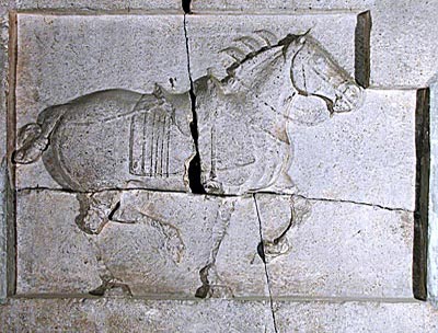 “白蹄乌”,此马周身乌黑,四蹄俱白。公元 618年深冬,李世民在陕西长武平定薛仁时的乘骑。据说李世民乘此马在追歼薛仁时,一昼夜间奔驰二百多里。时刻画面上白蹄乌昂首怒目,四蹄腾空,鬃竖立迎风,可想当年在黄土高原上奔驰的神态。李世民对它的赞语是:“依天长剑,追风骏足,纵辔平陇,回安定蜀。”