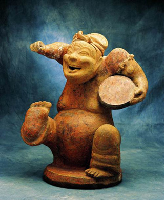 击鼓说唱俑,灰陶制,高55厘米,制作于东汉时期,出土于四川成都天回山崖墓,现收藏于中国历史博物馆。俑在汉代雕塑中有着十分重要的地位,题材广泛,内容丰富,从车马出行到侍卫家奴,从庖厨宴饮到歌舞百戏,几乎无所不包,反映了汉代五彩斑斓的社会生活。虽然这些俑比起秦代的同类作品尺寸相对较小,但表现出强烈的写实主义风采,具有很高的艺术价值。