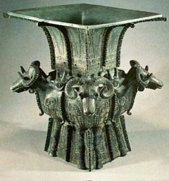商朝制作,出土于湖南宁乡。中国古代奴隶社会的青铜制品,根据用途不同而被分为酒器、食器、水器、兵器和工具等八类。尊就是当时常用的一种酒器,有时也被当作祭祀的礼器使用,经常雕塑成的动物形象。这件产生于商代后期的四羊方尊就是其中最典型的代表。