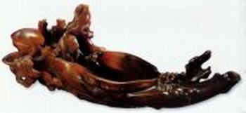 此犀角杯主要是装饰性的酒具,杯成船形,犀角雕刻,角端锥孔为流,中腹挖空为舱以盛酒。