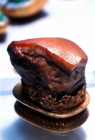 清代作品。用不透明的玉髓雕成,色峰纹理全是天然形成,玉工不过是妙手偶得。“肉”的肥瘦层次分明、肌理清晰、毛孔宛然,酷似一块新鲜猪肉,令人叹为观止。