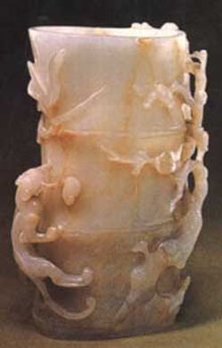 竹是东方美的象征。对竹的观赏和品味并使之成为一门艺术,是中国文化的重要特征之一。传世的竹筒形玉杯有多件,而这件明代的竹筒形螭虎纹玉杯是公认的代表之作。