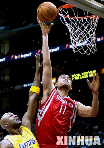 2007年3月30日,休斯敦火箭队球员姚明(右)在比赛中投篮。当日,在NBA常规赛中,休斯敦火箭队客场通过加时赛以107比104战胜洛杉矶湖人队。(来源: 新华社资料照片)