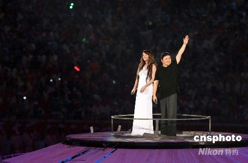 中国著名男歌手刘欢和英国著名女歌星莎拉·布莱曼(Sarah Brightman)在“鸟巢”中央共同演唱北京奥运会开幕式主题歌《you and me》。中新社发