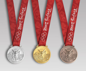 北京2008年奥运会奖牌直径为70毫米,厚6毫米。奖牌正面为国际奥委会统一规定的图案——插上翅膀站立的希腊胜利女神和希腊潘纳辛纳科竞技场。奖牌背面镶嵌着取自中国古代龙纹玉璧造型的玉璧,背面正中的金属图形上镌刻着北京奥运会会徽。