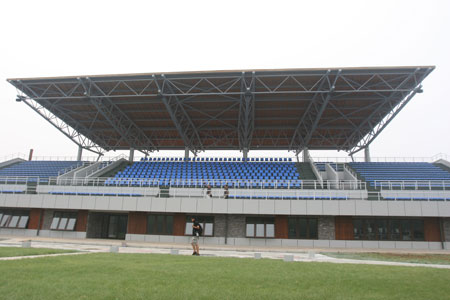 室外竞赛区有6座设计成长城烽火台样式的靶房。从看台上看去,这6座由灰砖砌筑长城烽火台造型的靶房就像是缩小版的万里长城。此外,竞赛区的挡弹墙也同样设计为长城烽火台造型。置身此处,恍若在长城内外。