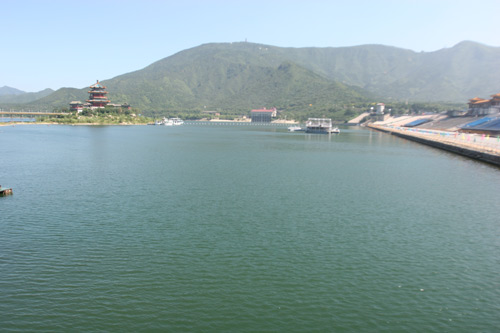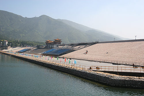 铁人三项奥运赛场位于十三陵水库内。天然游泳池波光粼粼,抬头即见翠绿葱郁的层峰叠峦,绿树成荫的长跑赛道和自行车赛道也都位于被植被覆盖的天然氧吧中,被国际铁联称为“世界上最亲近大自然铁人三项赛场馆”。